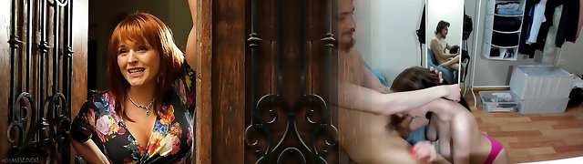 Meaty Step Mother's spear was caught by her nerdy stepson and she asked him to slurp it
