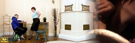 TUTOR4K. Young man poured tea on schoolteachers clothes to make her de-robe and bonk