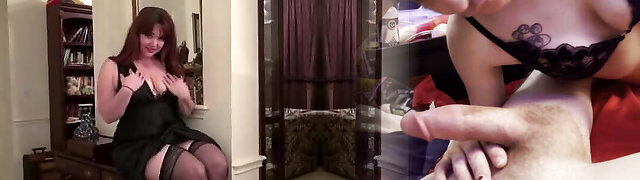 Mature in fishnet apparel teases with her pussy while he wanks