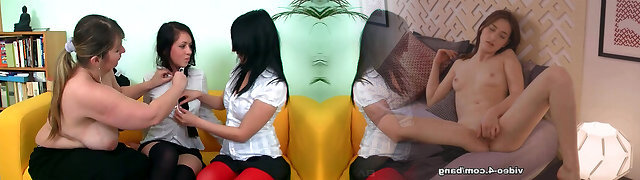 Zesty brunette school girls are seducing their professor for lesbian threeway