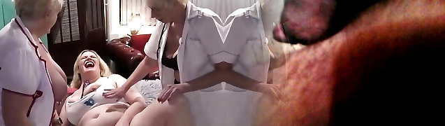 Paul Chaplin getting enticed into a foursome by lesbians in stockings