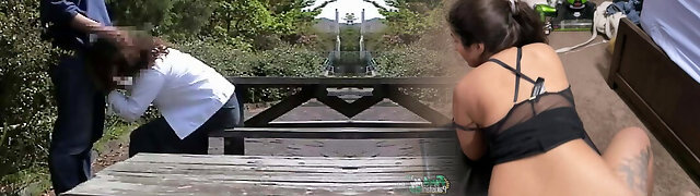Milf Humped and Creampied on a Picnic table in a Public Park with Good-sized Tits Bouncing
