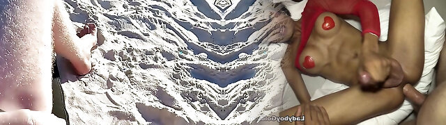 Two mature babes jerking their young paramour on the beach