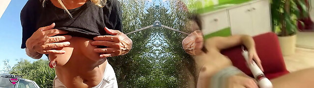 nippleringlover - horny milf outdoors without brassiere, flashing sexy ass, pierced snatch and huge pierced nipples