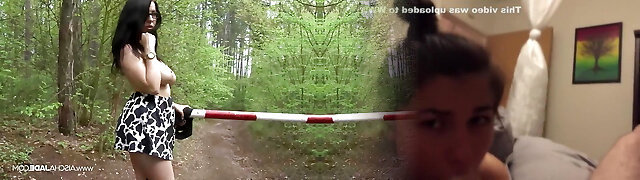 Chubby mature black-haired Candi Kayne gets cum on face outdoors