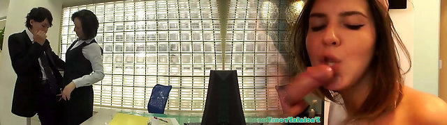 Elderly granny boss swallows two cocks on work place