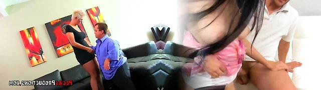Horny buxom mommy shares a good-sized cock with a midget hooker
