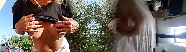 nippleringlover - horny milf outdoors without brassiere, flashing sexy ass, pierced snatch and huge pierced nipples