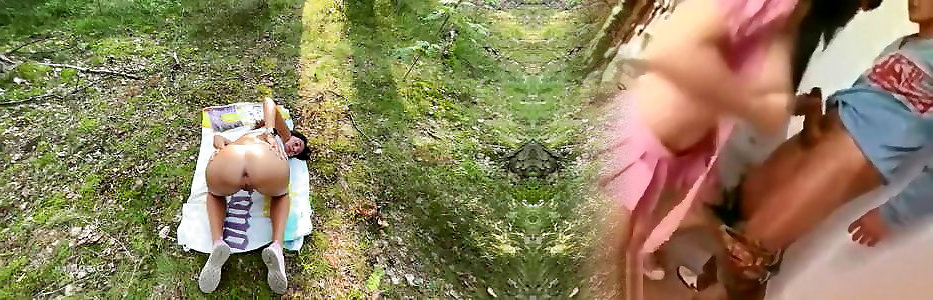 Double penetration with anal wood log and creamy orgasm in forest