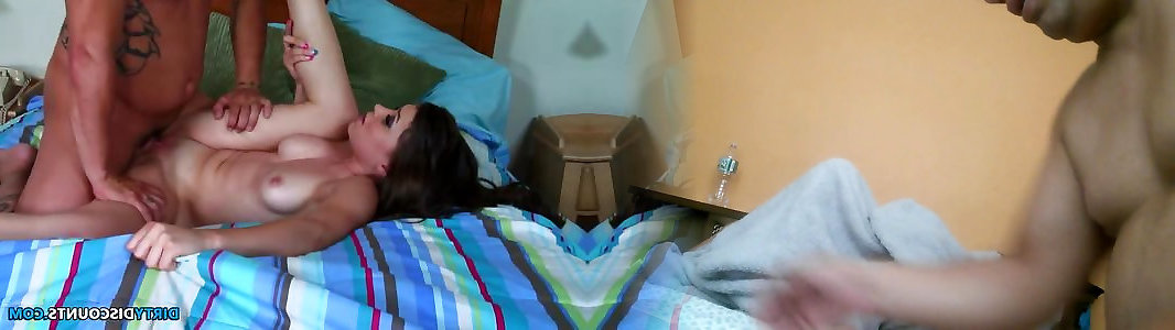 Youthful sweetheart with inborn bra-stuffers poked firm by 2 fellows