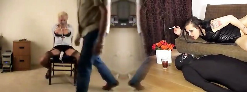 Trussed woman tickled stimulated