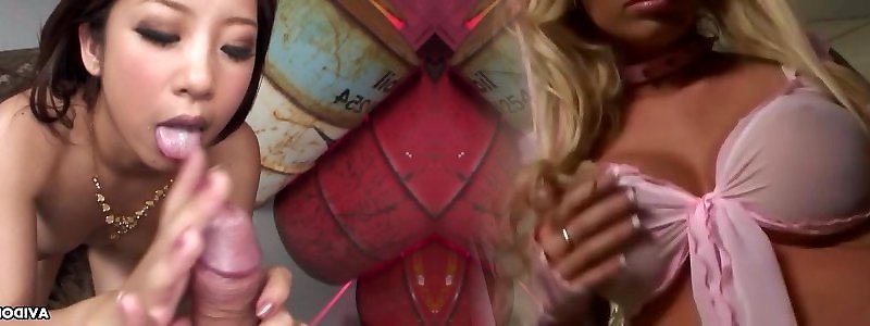 Excited boss welcome simultaneous deep throat from aroused lesbians