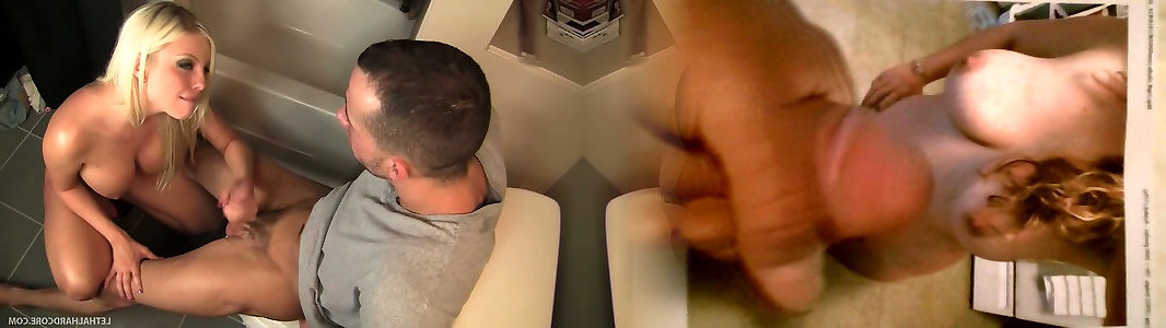 Obscene platinum-blonde superslut Britney Amber sucks moneytalks lesbian Jacks meatpipe in a restroom