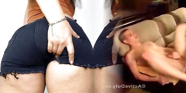 Ginger-haired Japanese crank Ayumu Sena in taut gold spandex teasing and pulverized on the couch