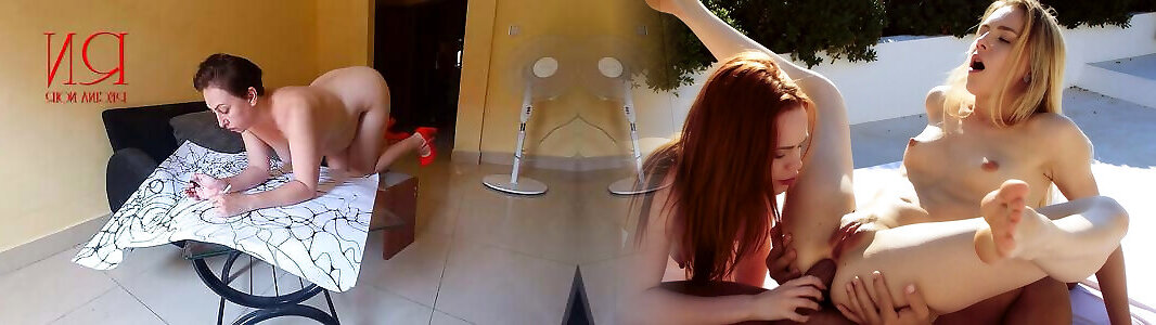 Nudist lady Regina Noir is drawing and painting strange abstract pattern. Relax music. Naked art workshop.