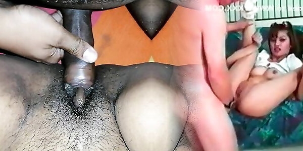 Ebony student gets her pussy drilled by a white guy while she licks a blonde MILF