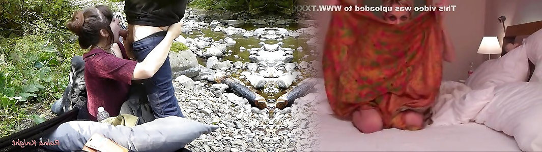Beautiful brunette fucks a man by a creek