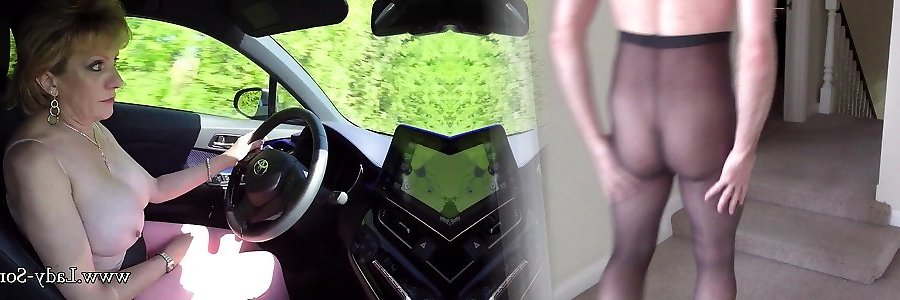 She is driving a camper in short microskirt and glossy stocking.