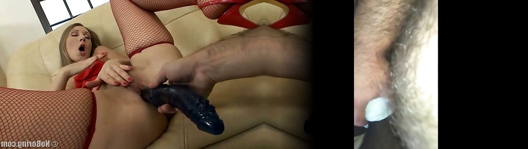 Inebriated honest haired chick in red fishnets gets her coochie banged with dark-hued faux-cock