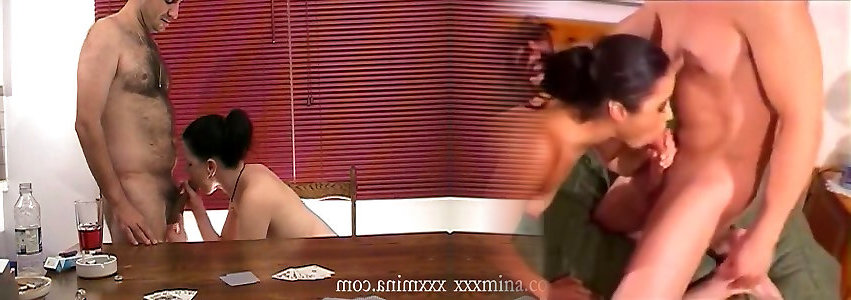 One wanton brown-haired biotch with super-cute assets satiates two drunk fellows