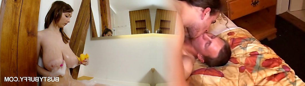 Romantic Milf with super gigantic udders gives boob banging lying in a 2 bi couple tub