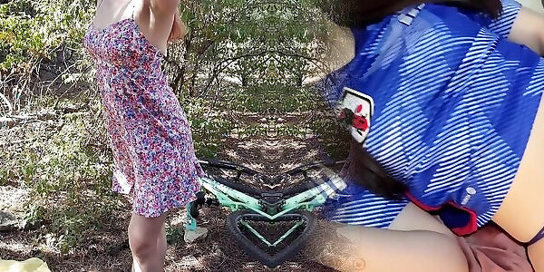 Stranger took on cam sexy girl in cute short dress masturbating in the forest