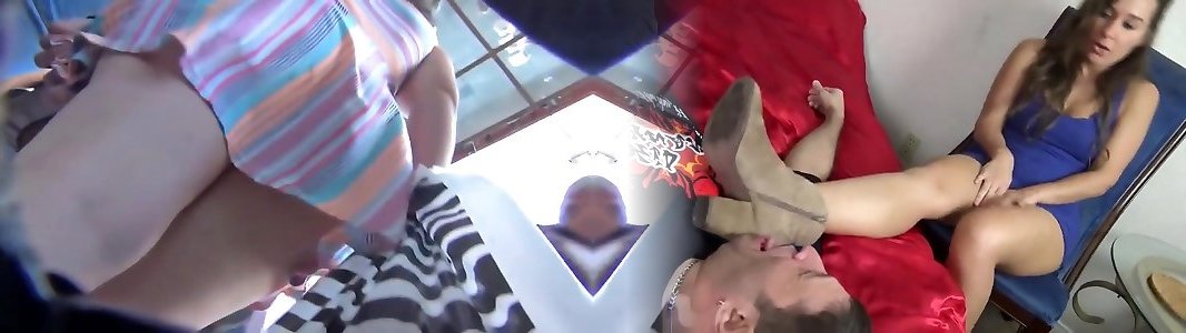 Sexy Domme in high stilettos and handsome dress tantalizes her trimmed foot prisoner