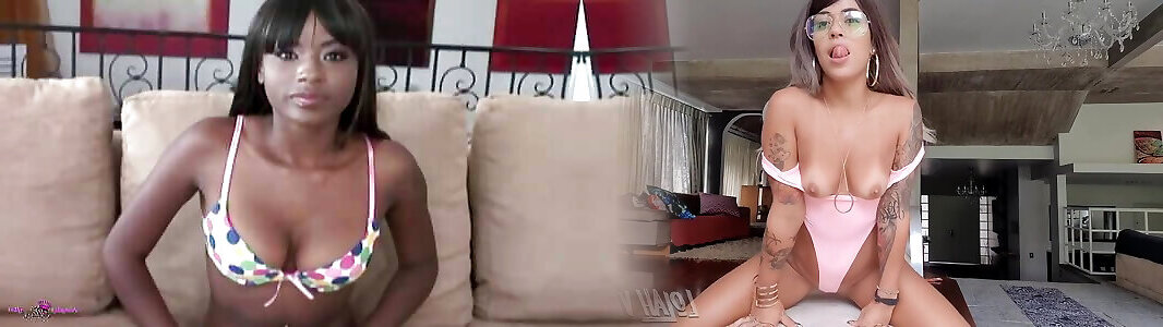 Dark-hued nubile with puffy fun bags gets banged in sofa by milky stud