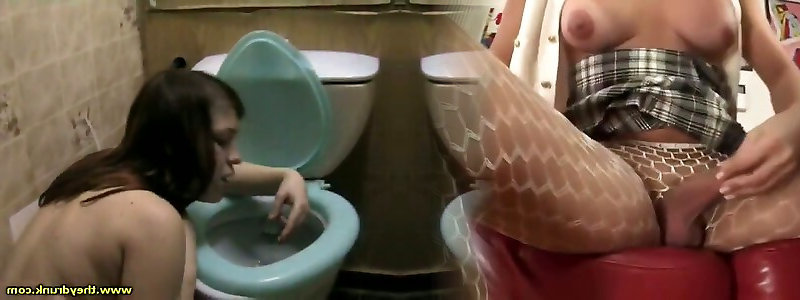 A toilet bitch swallows and impales her mini ass on a big dick