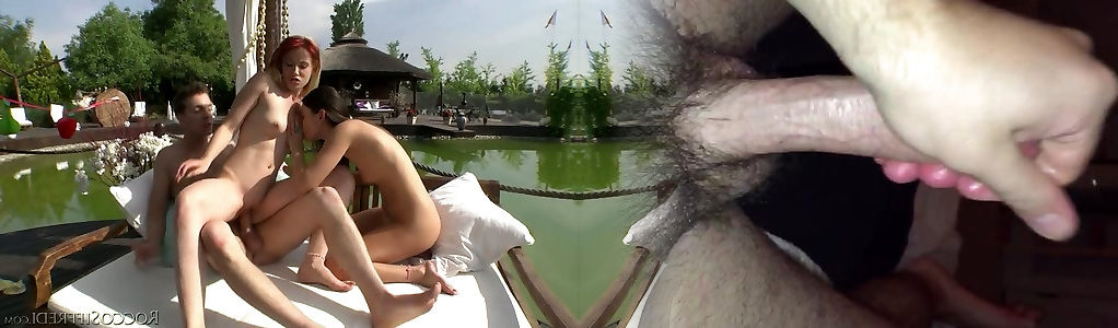 A couple of super-steamy well graced girlies satisfy one insatiable boy outdoors