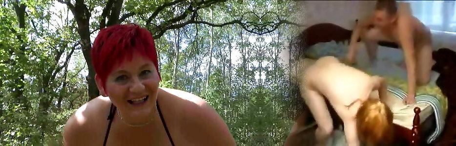 Chesty ginger-haired woman gives head to two boys in a park