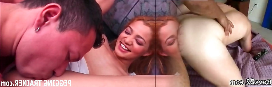 Curvy Redhead MILF Gets Fucked Hard By Her Strapon-ed GF In Front Of Her Wanking Friend