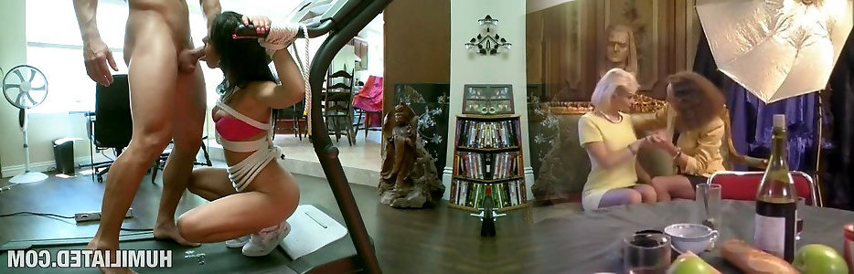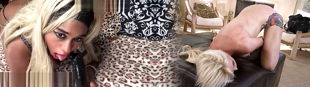 Perverted pale black-haired and blond experience on strap-on to give deep throat