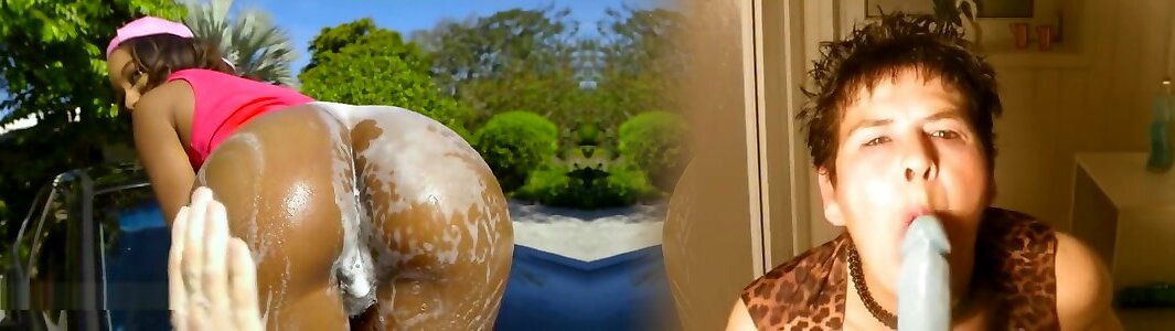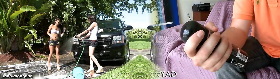 Round arse dark-hued helps boyfriend wash truck outdoor