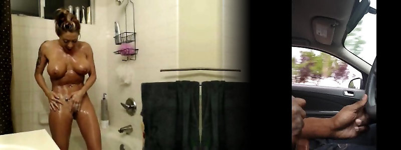 hidden huge cock of hunk catches massive titted milf in douche