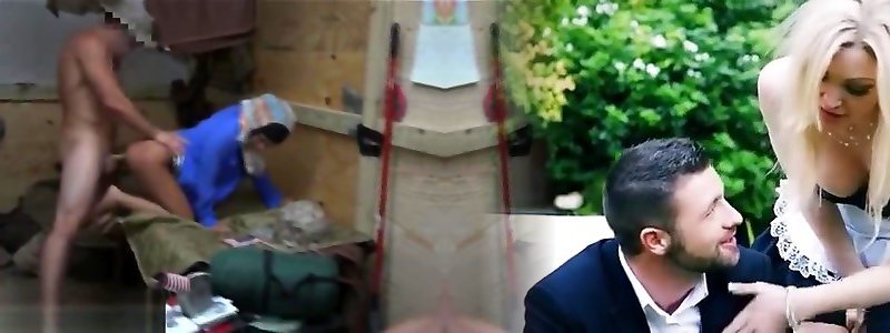 Blonde and brunette soldier sluts fuck in an army camp