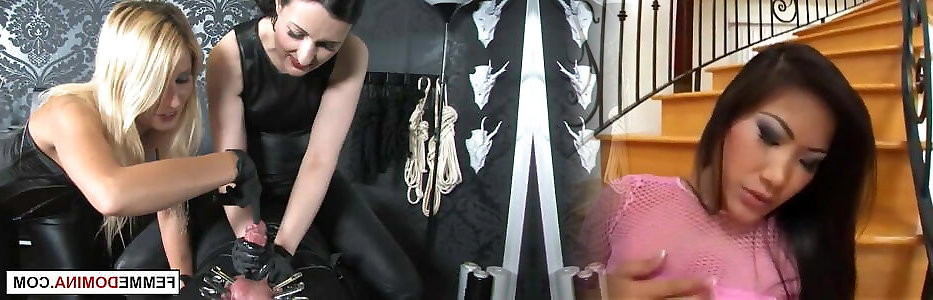 2 Euro dommes providing leather victim the cock ball torture therapy