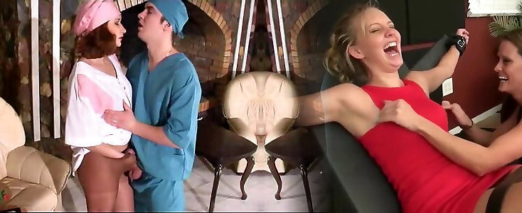 Towheaded in a straightjacket has threesome with two doctors
