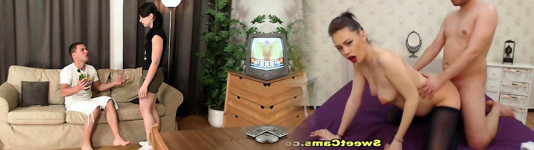 Skinny ponytailed brunette woman gets from the rear plowed on the couch, blows her bfs jizz-shotgun and gulps his cum.
