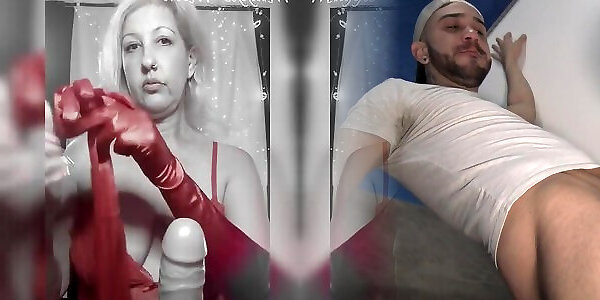 Teasing a Dildo in Red samlagin sex Glove