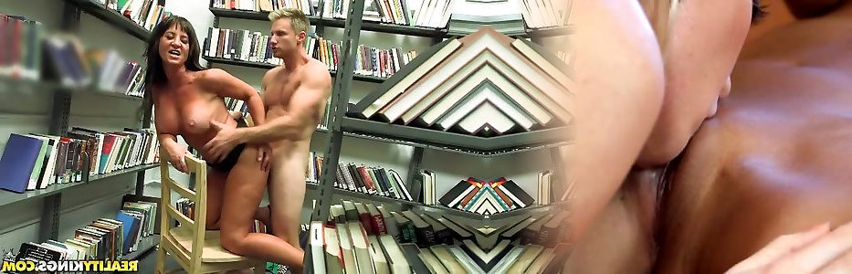 Sweet dark haired seductress gets her twat humped in the library