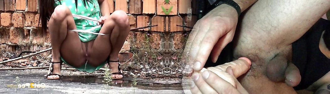 Pretty black-haired dame in green eyed sundress pisses in the ffm busty gloves of the street