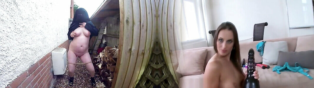 Burqa-clad Arab gets on her knees and takes 4 cocks up her anus