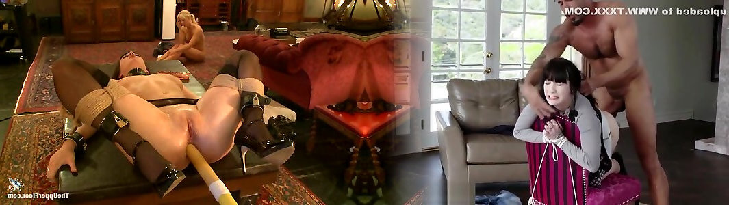 Chick roped and dude places objects inbetween her legs
