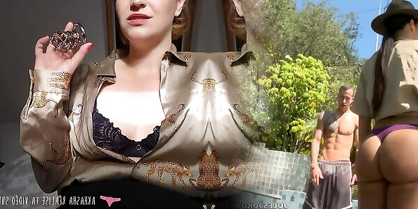 short sequence of humiliation of a dominatrix on a submissive in a chastity cage part 3