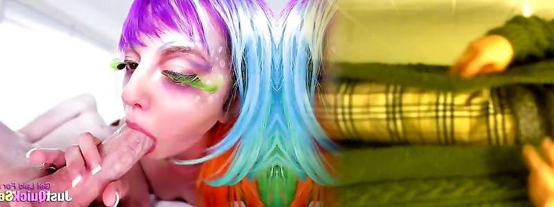 Rainbow haired teenager deep throats boner