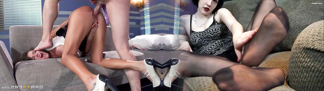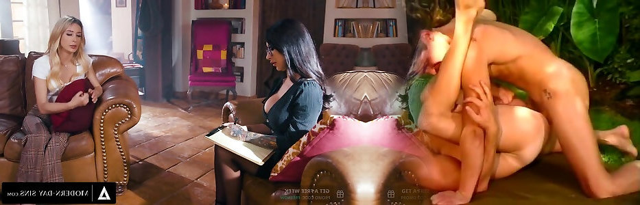 Threesome with dark haired hotties on the shrinks couch