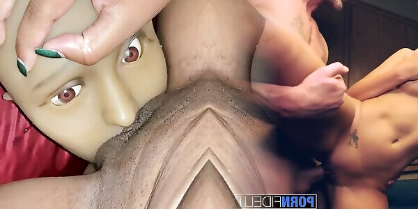 Slut in stockings gives blowjob and licks anal, creampie in doggystyle