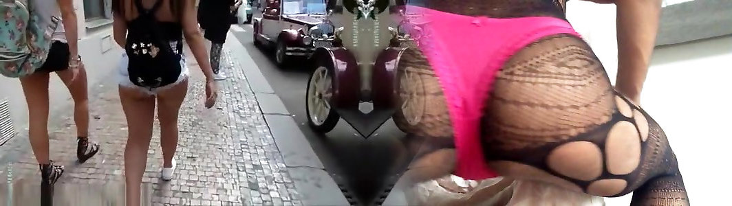 Street candid with young bimbos in short jeans microskirt