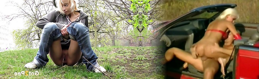 Brief haired auburn female pulls down her denim and pisses in the park